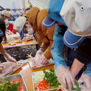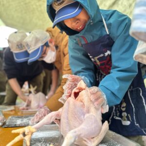 ちょっぴり閲覧注意!?鶏のお腹に野菜を詰めていきます。