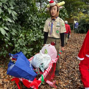 団委員長と各隊長に、スカウトたちが1年間の感謝をこめて、手作りのプレゼントを渡しました。