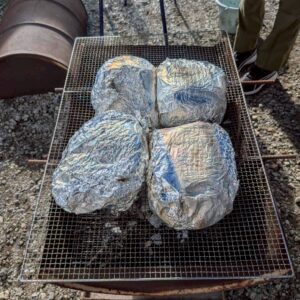 丁寧に包んだら、一匹ずつ名前をつけて、ドラム缶で焼いていきます。