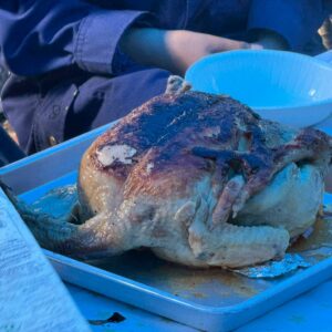 65団名物、頭と手足つき鶏の丸焼きです。