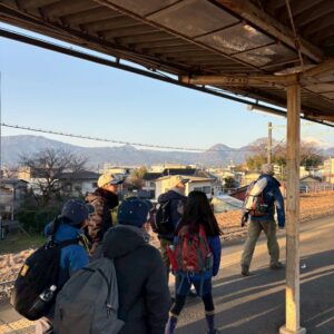早朝から電車を乗り継いで登山口まで向かいました。あそこに見えるあの尖った山に登るよ!