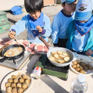 みんなでハンバーガーの肉をこねて、まぁるい形を作ります。すごい上手にできました。
