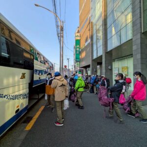 早朝からバスでスキー場に向かいました。
