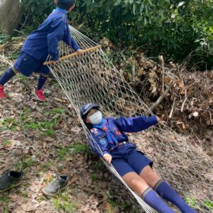 休憩時間には、副団委員長が森の木にハンモックを掛けてくれ、みんな大喜び!交代で乗って遊びました。